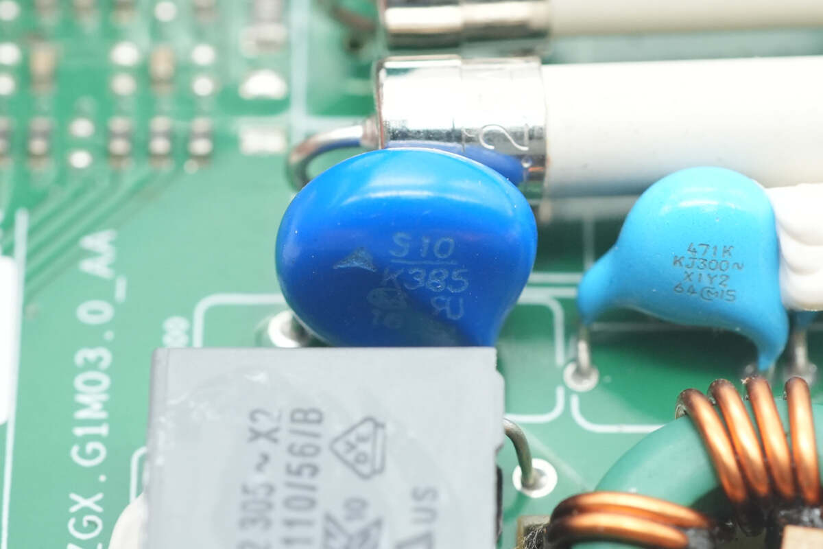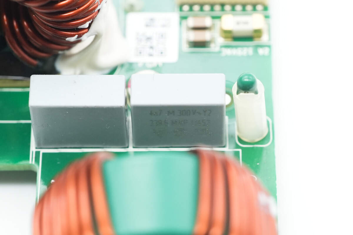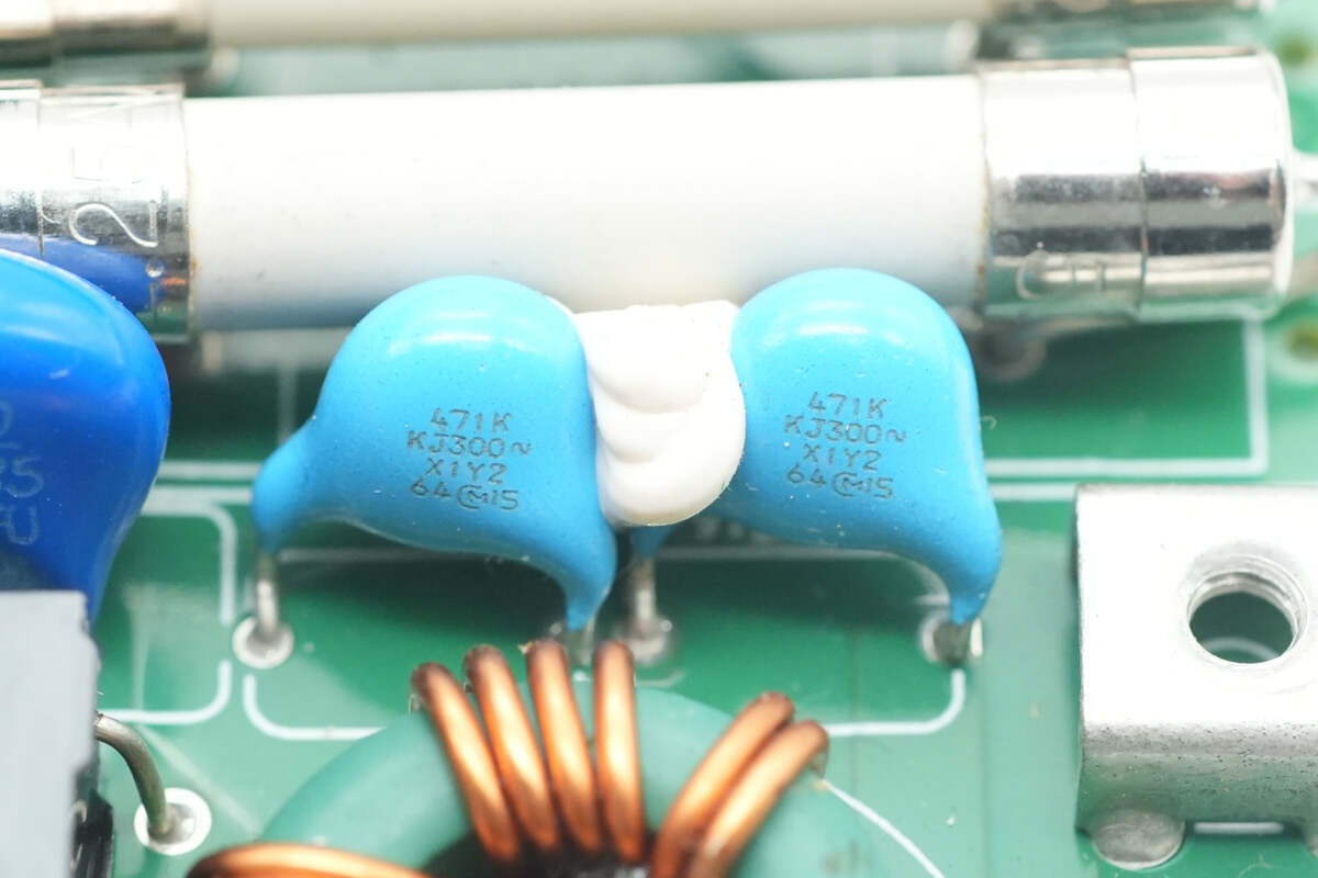 麦拉片下方设有保险丝,压敏电阻,安规X2电容,Y电容,共模电感。