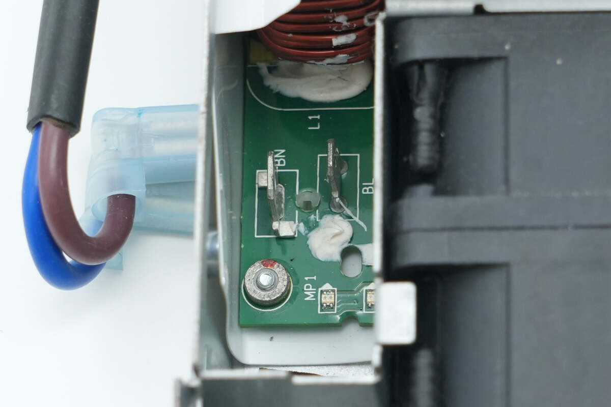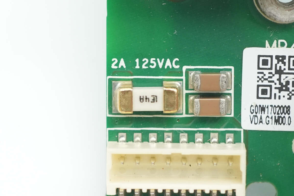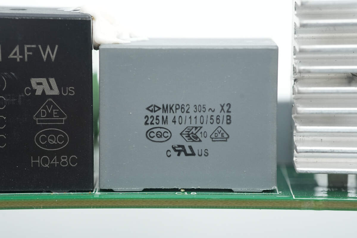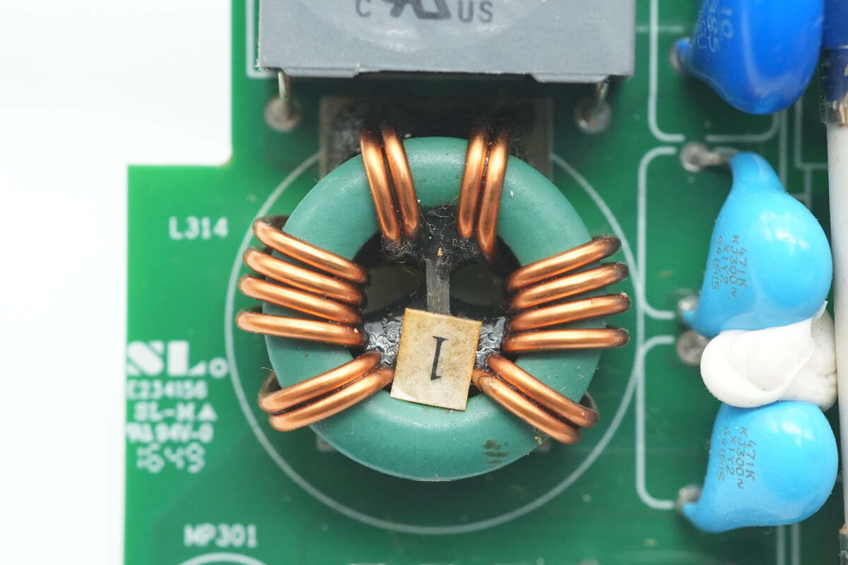 麦拉片下方设有保险丝,压敏电阻,安规X2电容,Y电容,共模电感。