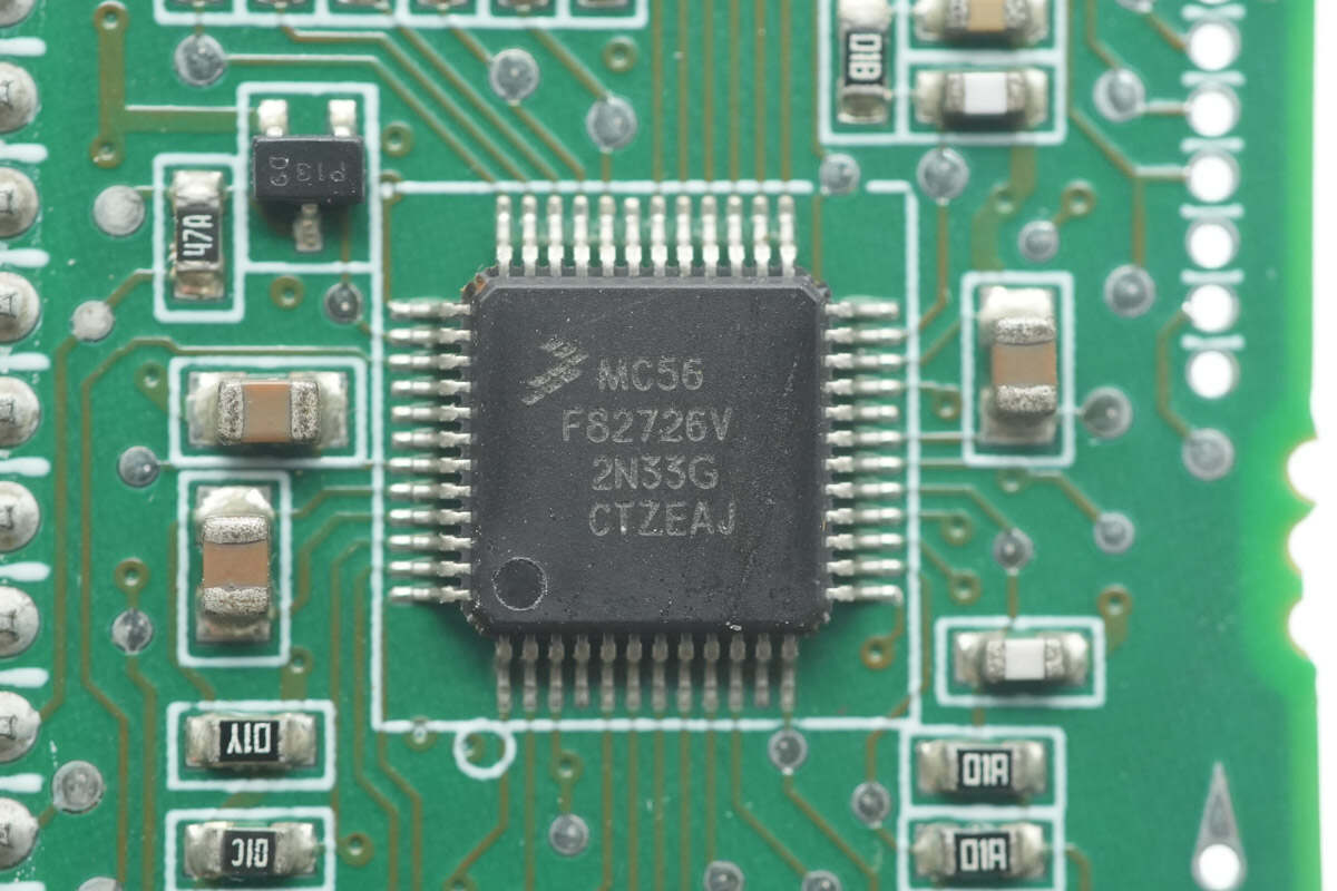 PFC控制器来自恩智浦,型号MC56F82726VLF,芯片内部集成32位56800EX内核,主频为100MHz,集成32KB FLASH和6KB SRAM,支持2.7-3.6V工作电压,采用LQFP48封装。