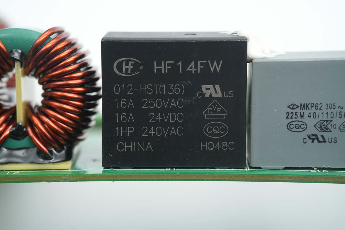 继电器来自宏发,型号HF14FW/012-HST,继电器内置一组常开触点,触点容量为16A,线圈电压为12V。