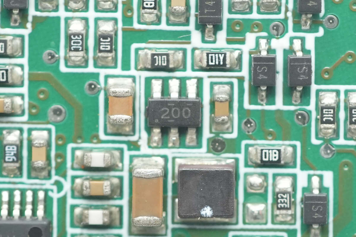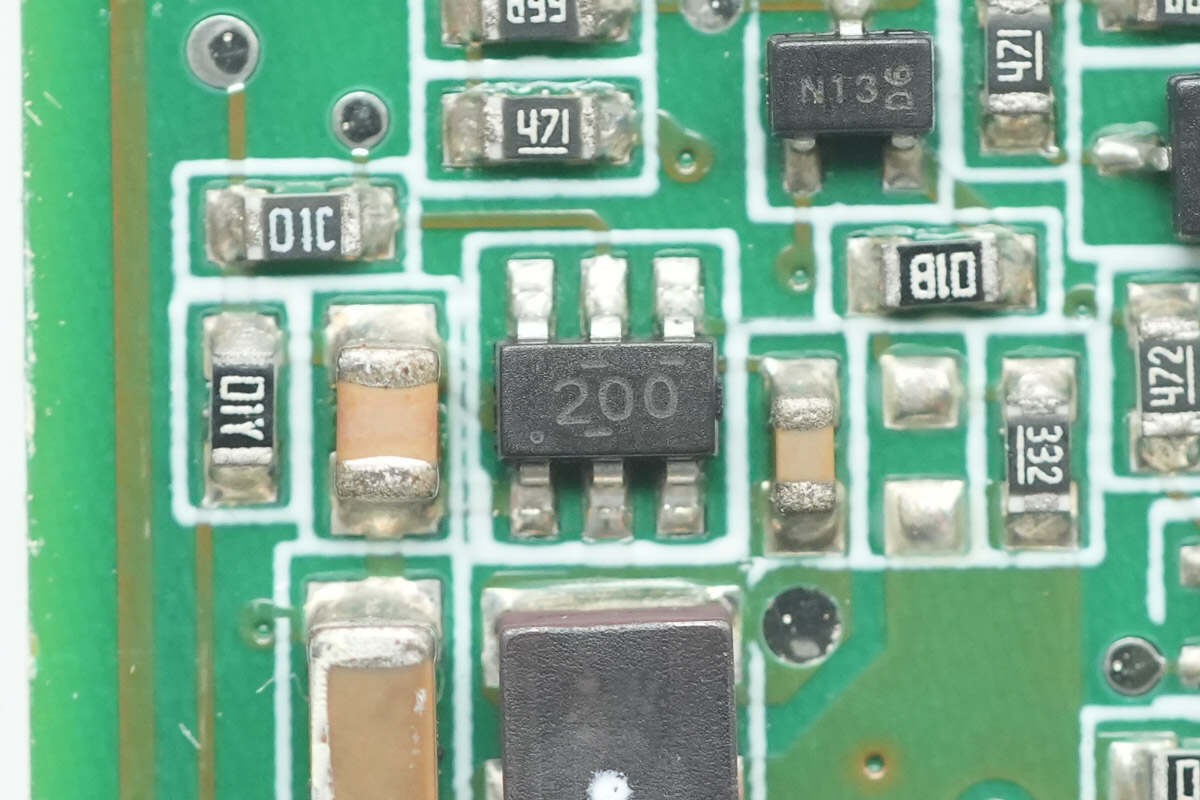 降压芯片来自德州仪器,丝印200,型号TPS562200,芯片内部集成开关管,支持17V输入电压,输出电流2A,采用SOT23封装。