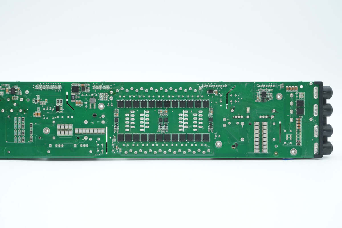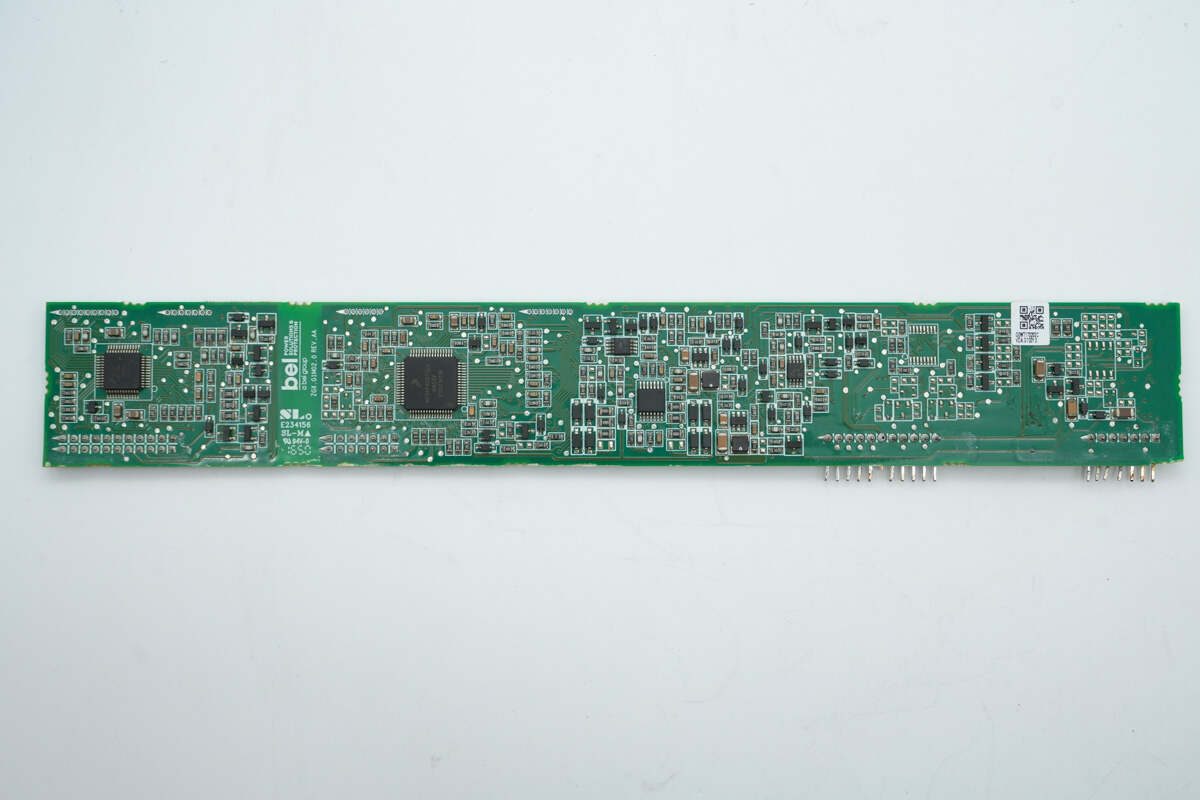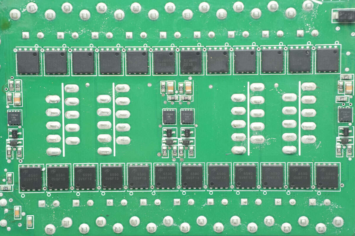 PCBA模块背面一览,左侧设有高压滤波电容和隔离驱动器,右侧设有同步整流管和驱动器,谐振电容和运放等元件。