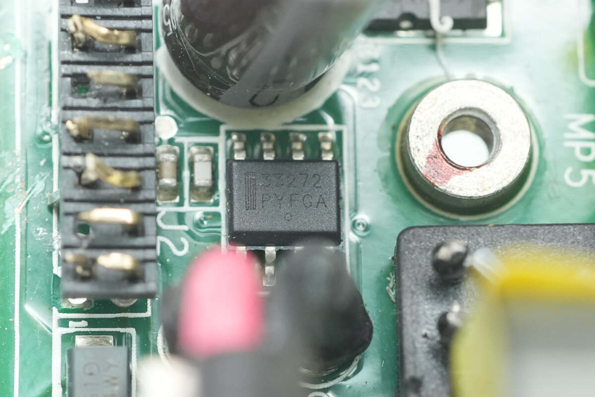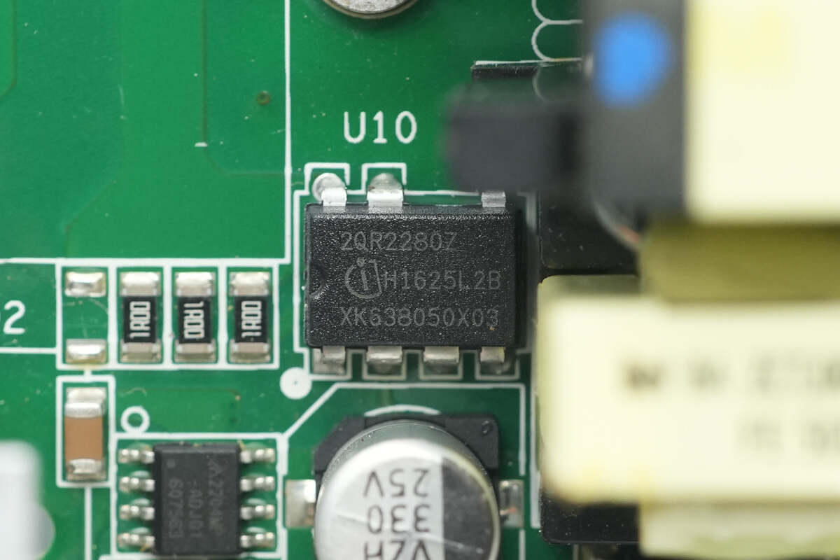 待机电源芯片来自英飞凌,型号ICE2QR2280Z,芯片内部集成800V开关管,宽电压输入下支持31W输出功率,采用DIP-7封装。