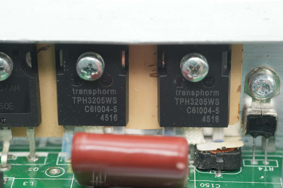 氮化镓开关管来自瑞萨,型号TPH3205WS,耐压600V,导阻52mΩ,采用TO-247 3L封装,用于图腾柱PFC快速半桥,引脚设有电流互感器。