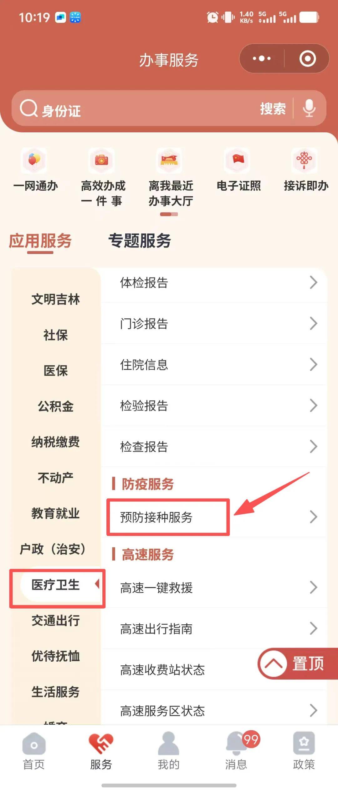 吉事办最下面菜单栏中点击“服务”—“医疗卫生”—“防疫服务”—“预防接种服务”。