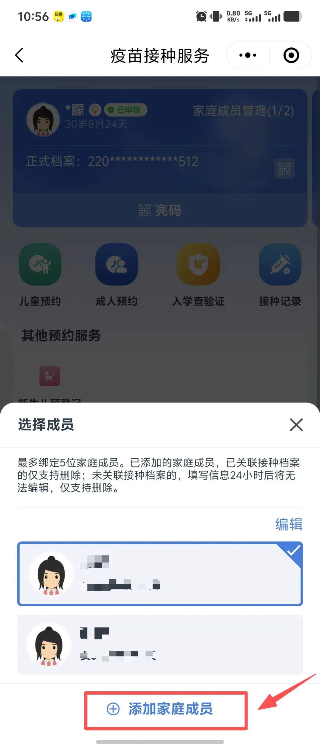 如果你还想给为家人代领,可以继续点击“家庭成员管理”—“添加家庭成员”,按照提示操作就可以添加啦!最多可以绑定5位家庭成员哦!