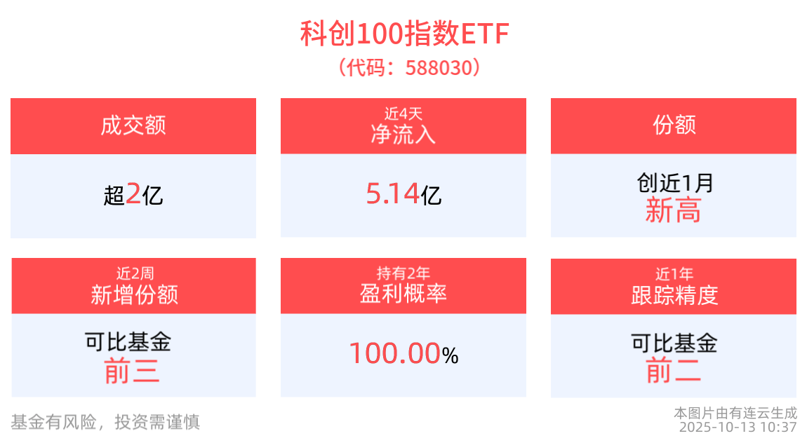 流动性方面,科创100指数ETF盘中换手3.46%,成交2.40亿元。拉长时间看,截至10月10日,科创100指数ETF近1年日均成交4.11亿元,居可比基金第一。