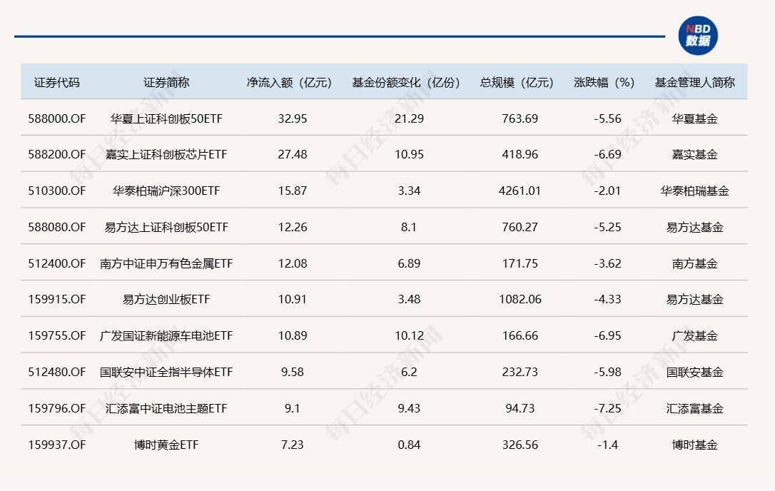 Wind数据显示,在10月10日非货币ETF市场中,华夏上证科创板50ETF基金份额增加21.29亿份,净流入额为32.95亿元;嘉实上证科创板芯片ETF基金份额增加10.95亿份,净流入额为27.48亿元;华泰柏瑞沪深300ETF基金份额增加3.34亿份,净流入额为15.87亿元。