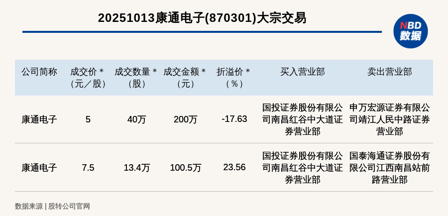 每经讯,2025年10月13日,新三板创新层公司康通电子(870301,收盘价:6.07元)发生2笔大宗交易,总成交金额为300.5万元,成交金额最高的一笔成交价5元/股,成交数量40万股,成交金额200万元,折价17.63%。买入营业部是国投证券股份有限公司南昌红谷中大道证券营业部,卖出营业部是申万宏源证券有限公司靖江人民中路证券营业部。