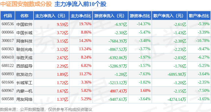 资金流向方面,中证国安(399813)指数成份股当日主力资金净流入合计13.52亿元,游资资金净流出合计11.0亿元,散户资金净流出合计2.53亿元。成份股资金流向详情见下表: