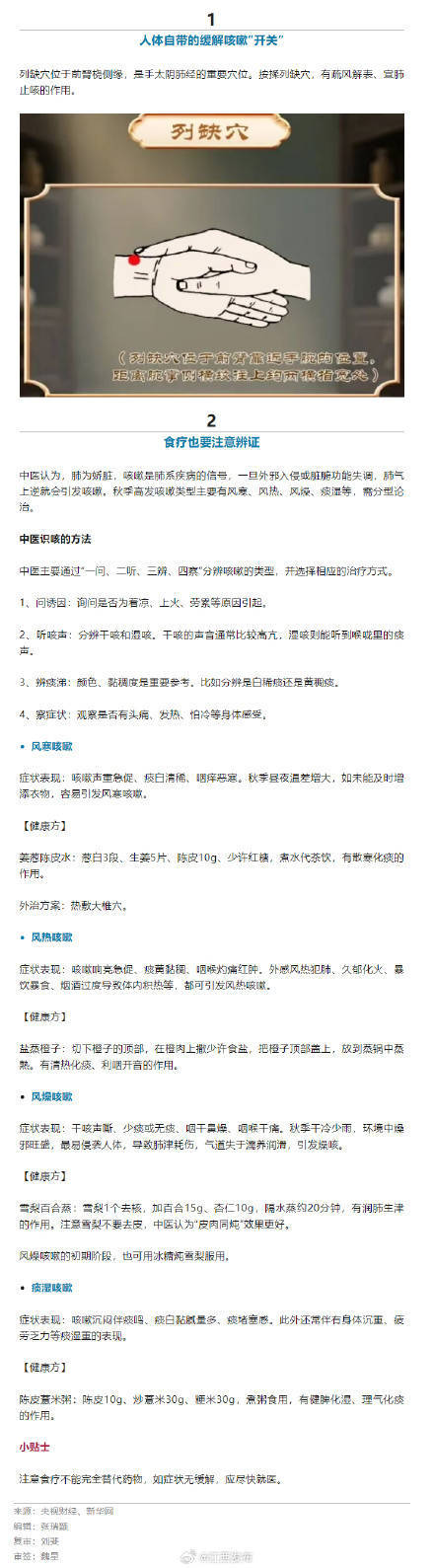 秋意渐深,天气转凉,此时燥邪当令,咳嗽发病率明显攀升。按揉列缺穴可以缓解咳嗽。