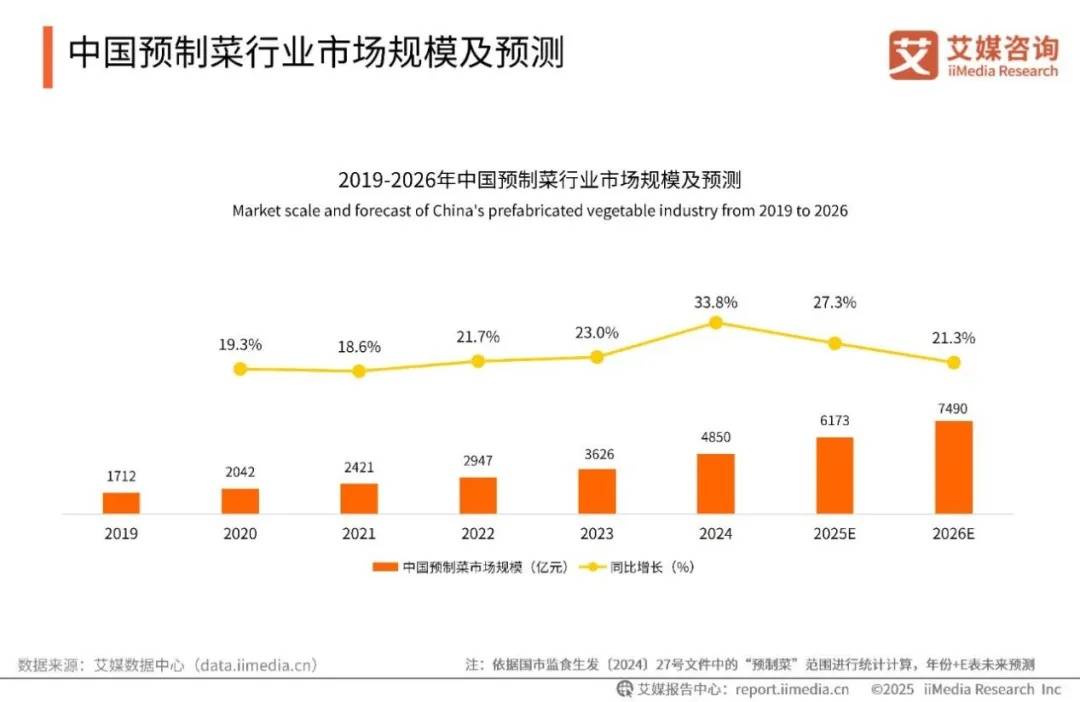 据艾媒咨询所发布的数据显示,2024年我国预制菜市场的规模为4850亿,同比增长33.8%,预计到2026年将会达到7490亿元。