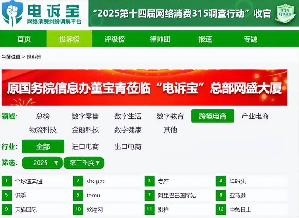 Q3,用户投诉跨境电商上榜平台12家,依次为:全球速卖通、shopee、寺库、洋码头、识季、temu、阿里巴巴国际站、亚马逊、天猫国际、敦煌网、别样、中免日上。