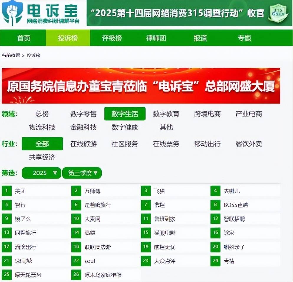 投诉量TOP10依次为:美团、万师傅、飞猪、去哪儿、智行、走着瞧旅行、携程、BOSS直聘、饿了么、大麦网;