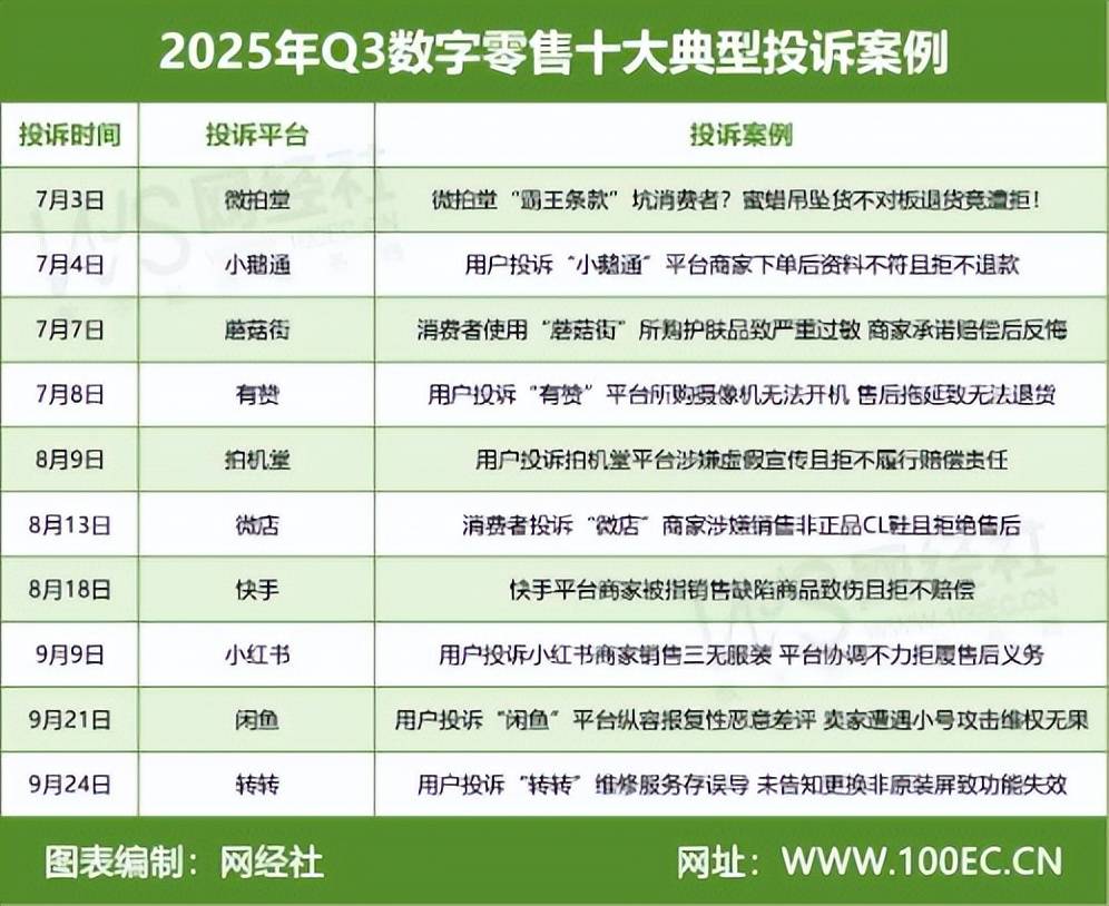 报告涉及了数字零售、生活服务电商及跨境电商三大板块,公布了2025年Q3网络消费投诉数据及《数字零售十大典型投诉案例》《生活服务电商十大典型投诉案例》和《跨境电商十大典型投诉案例》。