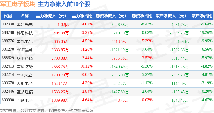 从资金流向上来看,当日军工电子板块主力资金净流出3.31亿元,游资资金净流入1.31亿元,散户资金净流入2.0亿元。军工电子板块个股资金流向见下表: