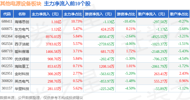 从资金流向上来看,当日其他电源设备板块主力资金净流出7.31亿元,游资资金净流入5616.83万元,散户资金净流入6.75亿元。其他电源设备板块个股资金流向见下表: