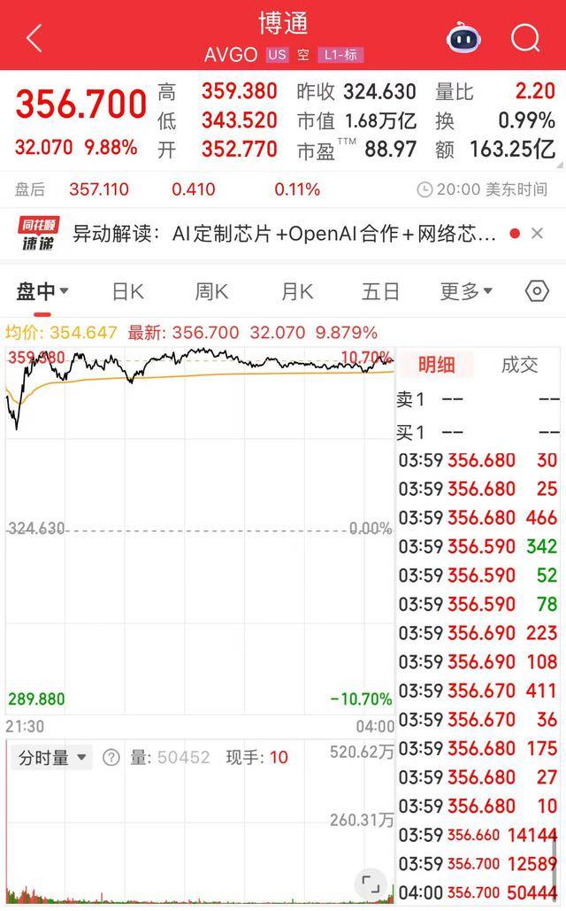 消息公布后,同花顺数据显示,博通的股价一度涨超10%。