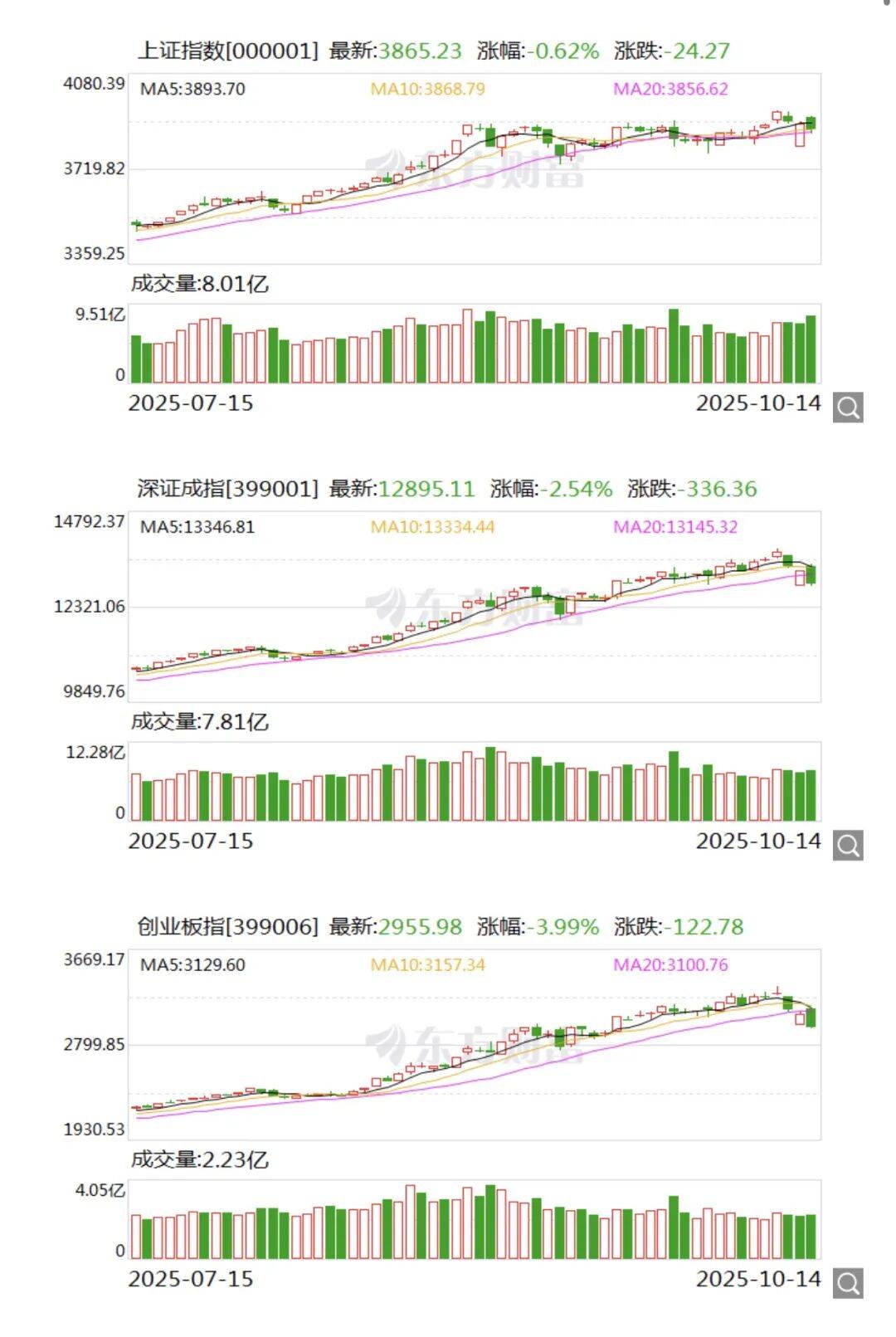 A股三大指数今日集体回调,截至收盘,沪指跌0.62%,收报3865.23点;深证成指跌2.54%,收报12895.11点;创业板指跌3.99%,收报2955.98点。沪深两市成交额达到25762亿,较昨日放量2215亿。