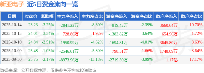证券之星消息,截至2025年10月14日收盘,新亚电子(605277)报收于23.23元,下跌3.25%,换手率4.55%,成交量14.46万手,成交额3.42亿元。