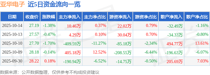 证券之星消息,截至2025年10月14日收盘,亚华电子(301337)报收于27.19元,下跌1.38%,换手率2.76%,成交量1.02万手,成交额2802.53万元。