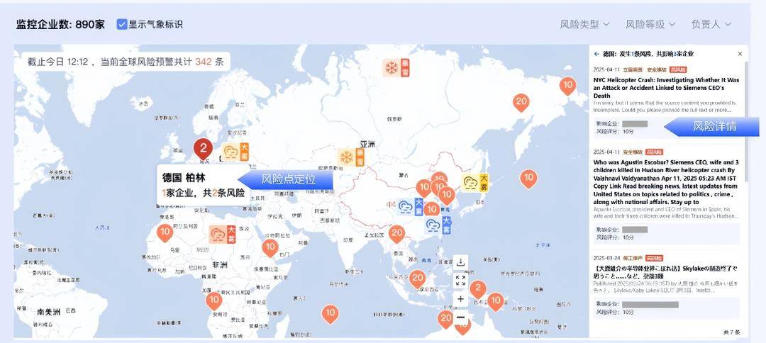 技术专家介绍,“世界风险地图”作为全天候智能预警平台,可将风险事件与供应商的地理位置实时关联,自动生成动态全球风险热力图,直观呈现不同区域内的风险分布情况及受影响的供应商数量。其风险监测范围覆盖全球220多个国家与地区,支持130多种语言实时翻译,接入超30万个多渠道数据源,包括各国地震局、气象局及主流媒体等,可规避原材料供应、生产经营、物流运输等181项供应中断风险,助力企业“一眼洞察全局”。