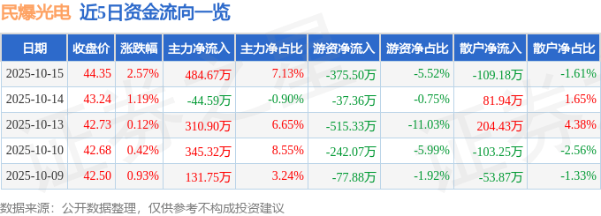 证券之星消息,截至2025年10月15日收盘,民爆光电(301362)报收于44.35元,上涨2.57%,换手率5.23%,成交量1.55万手,成交额6796.97万元。