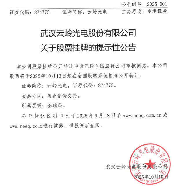10月13日,武汉云岭光电股份有限公司成功在全国中小企业股份转让系统挂牌(即“新三板”)),证券简称:云岭光电,证券代码:874775。