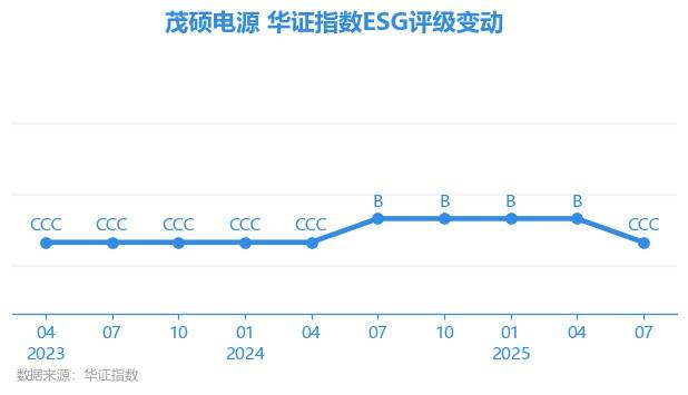 日前,华证指数公布了新一期(2025年7月31日)的ESG评级结果,茂硕电源(002660.SZ)获得CCC评级(华证指数评级为C起至AAA九档,C为最低档,AAA为其最高一级评级/AA为其第二档),上一期(2025年4月30日)ESG评级为B。本期ESG评级在321家电气设备行业A股上市公司中排名第246(上一期排名第241)。