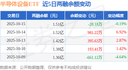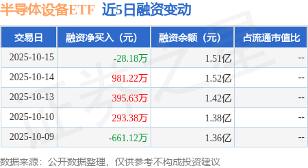 证券之星消息,10月15日,半导体设备ETF(561980)融资买入2258.84万元,融资偿还2287.02万元,融资净卖出28.18万元,融资余额1.51亿元,近20个交易日中有11个交易日出现融资净买入。