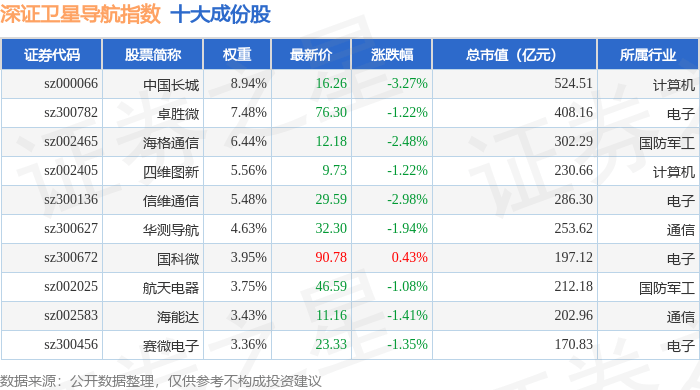证券之星消息,10月16日,深证卫星导航(970050)指数报收于3149.12点,跌1.91%,成交148.96亿元,换手率2.91%。当日该指数成份股中,上涨的有5家,光庭信息以2.21%的涨幅领涨,下跌的有36家,奥普光电以4.02%的跌幅领跌。