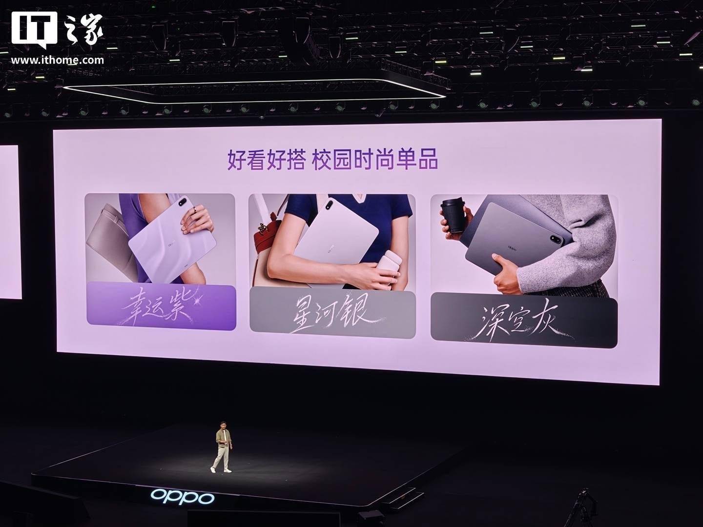 据 OPPO 首席产品官兼一加创始人刘作虎介绍,这款平板拥有幸运紫、星河银、深空灰三种配色可选,其中幸运紫的背板采用了全新的流光幻彩工艺,轻轻转动就能从背板中看到闪耀的星河,其余两种配色则采用纯色设计。