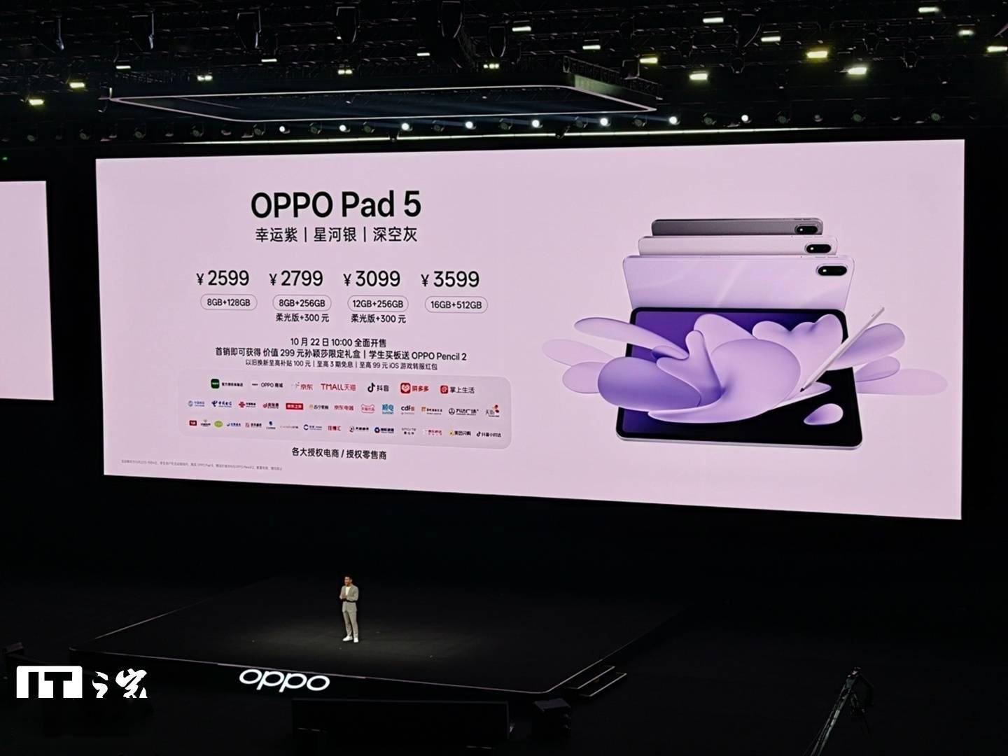 IT之家 10 月 16 日消息,OPPO 今晚举行 Find X9 新品发布会,推出 Find X9 系列手机、Watch S、Pad 5 等新品,其中 Pad 5 搭载天玑 9400 + 芯片,主打无纸化笔记、PC 级 WPS 办公套件等,拥有全新“幸运紫”配色,售价 2599 元起,10 月 22 日上午 10 点全面开售。