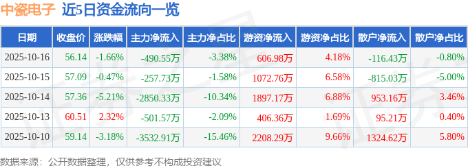 证券之星消息,截至2025年10月16日收盘,中瓷电子(003031)报收于56.14元,下跌1.66%,换手率0.76%,成交量2.57万手,成交额1.45亿元。