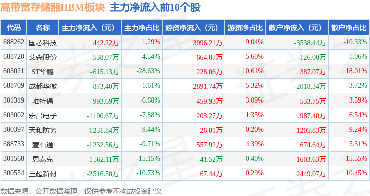 从资金流向上来看,当日高带宽存储器HBM板块主力资金净流出35.64亿元,游资资金净流入9.77亿元,散户资金净流入25.87亿元。高带宽存储器HBM板块个股资金流向见下表: