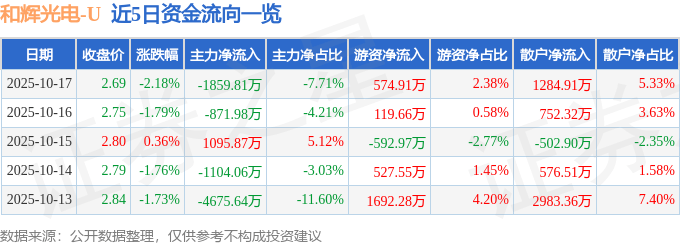 证券之星消息,截至2025年10月17日收盘,和辉光电(688538)报收于2.69元,下跌2.18%,换手率1.54%,成交量88.64万手,成交额2.41亿元。