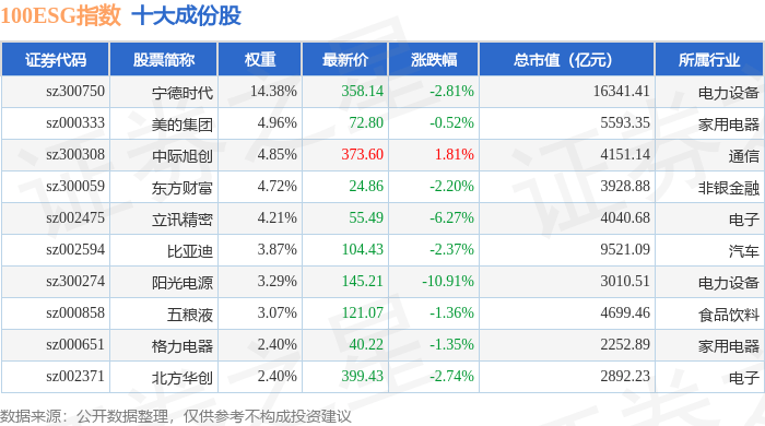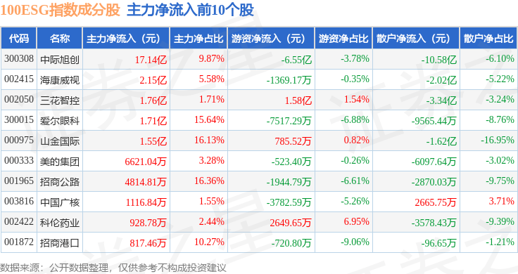 资金流向方面,100ESG(970027)指数成份股当日主力资金净流出合计182.91亿元,游资资金净流入合计59.74亿元,散户资金净流入合计123.17亿元。成份股资金流向详情见下表: