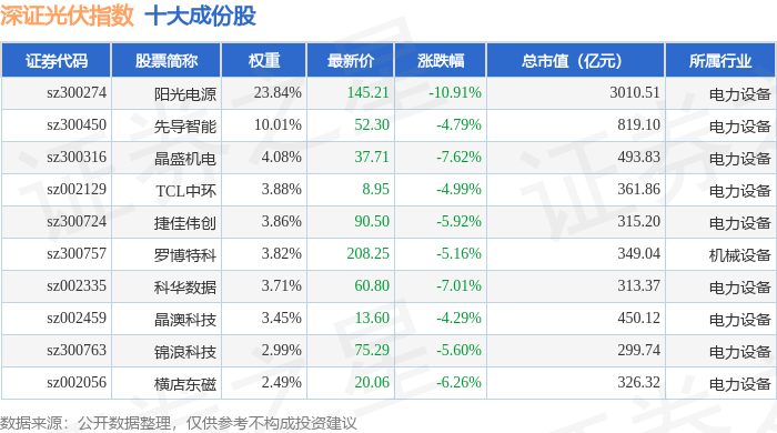 证券之星消息,10月17日,深证光伏(970035)指数报收于3393.57点,跌6.55%,成交497.24亿元,换手率2.96%。当日该指数成份股中,上涨的有1家,晓程科技以3.01%的涨幅领涨,下跌的有49家,阳光电源以10.91%的跌幅领跌。