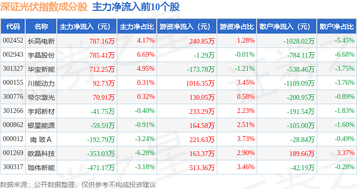 资金流向方面,深证光伏(970035)指数成份股当日主力资金净流出合计53.86亿元,游资资金净流入合计14.81亿元,散户资金净流入合计39.05亿元。成份股资金流向详情见下表: