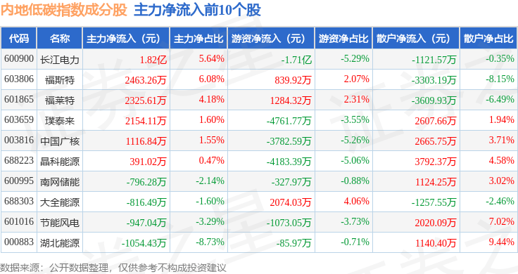 资金流向方面,内地低碳(000977)指数成份股当日主力资金净流出合计101.5亿元,游资资金净流入合计19.64亿元,散户资金净流入合计81.86亿元。成份股资金流向详情见下表: