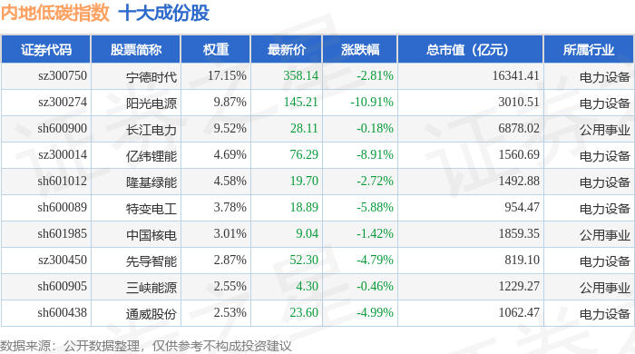 证券之星消息,10月17日,内地低碳(000977)指数报收于2022.91点,跌4.29%,成交984.07亿元,换手率1.41%。当日该指数成份股中,上涨的有1家,桂冠电力以0.56%的涨幅领涨,下跌的有49家,阳光电源以10.91%的跌幅领跌。