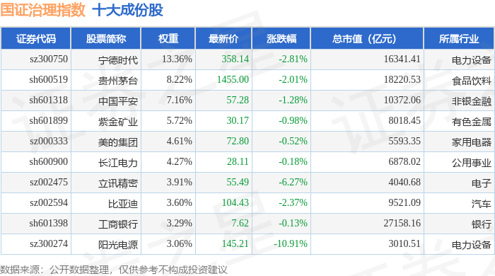 证券之星消息,10月17日,国证治理(399322)指数报收于10071.79点,跌2.08%,成交1480.62亿元,换手率0.5%。当日该指数成份股中,上涨的有7家,农业银行以1.74%的涨幅领涨,下跌的有43家,阳光电源以10.91%的跌幅领跌。