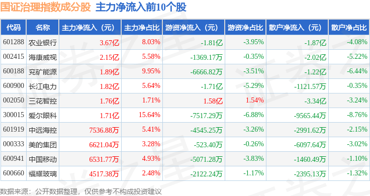 资金流向方面,国证治理(399322)指数成份股当日主力资金净流出合计109.14亿元,游资资金净流入合计34.23亿元,散户资金净流入合计74.91亿元。成份股资金流向详情见下表: