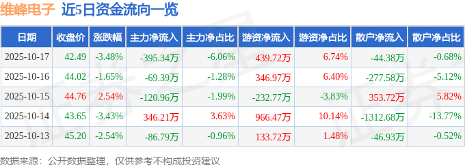 证券之星消息,截至2025年10月17日收盘,维峰电子(301328)报收于42.49元,下跌3.48%,换手率2.99%,成交量1.51万手,成交额6522.69万元。