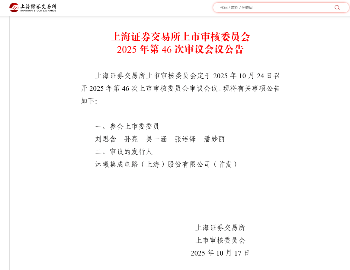 上交所上市审核委员会10月17日公告,定于2025年10月24日召开2025年第46次上市审核委员会审议会议,审议沐曦集成电路(上海)股份有限公司首发事项。