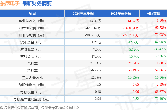 据证券之星公开数据整理,近期东尼电子(603595)发布2025年三季报。截至本报告期末,公司营业总收入14.57亿元,同比上升1.5%,归母净利润-1460.51万元,同比上升65.72%。按单季度数据看,第三季度营业总收入6.18亿元,同比上升2.51%,第三季度归母净利润2660.7万元,同比上升11.1%。本报告期东尼电子短期债务压力上升,流动比率达0.52。