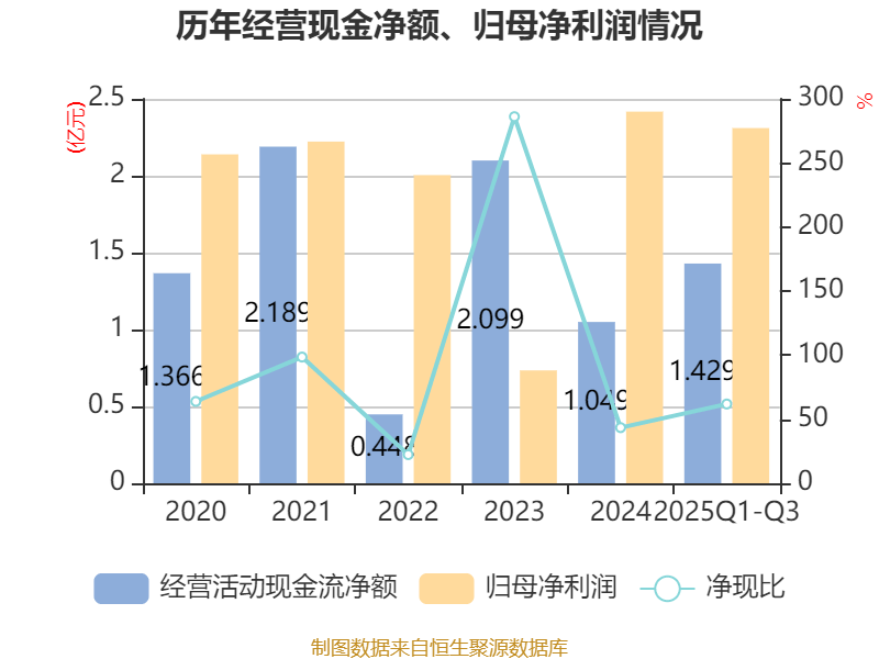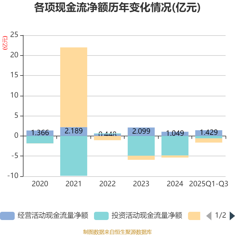 2025年前三季度,公司经营活动现金流净额为1.43亿元,同比增长77.44%;筹资活动现金流净额-1.05亿元,同比减少3246.73万元;投资活动现金流净额-5893.93万元,上年同期为-4.92亿元。