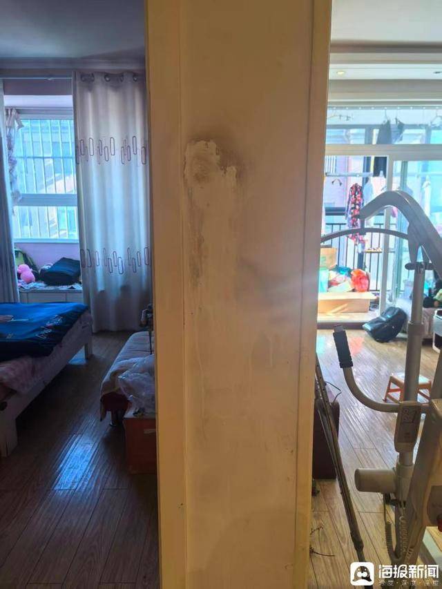 除此之外,她每天的大部分时间都用来做康复训练。其中,最主要的就是进行站立训练。每天,母亲会通过电动移位机把她从轮椅上拉起来,让她贴着墙面进行站立。记者注意到,芳若每天进行站立训练的墙面已磨出了明显痕迹。