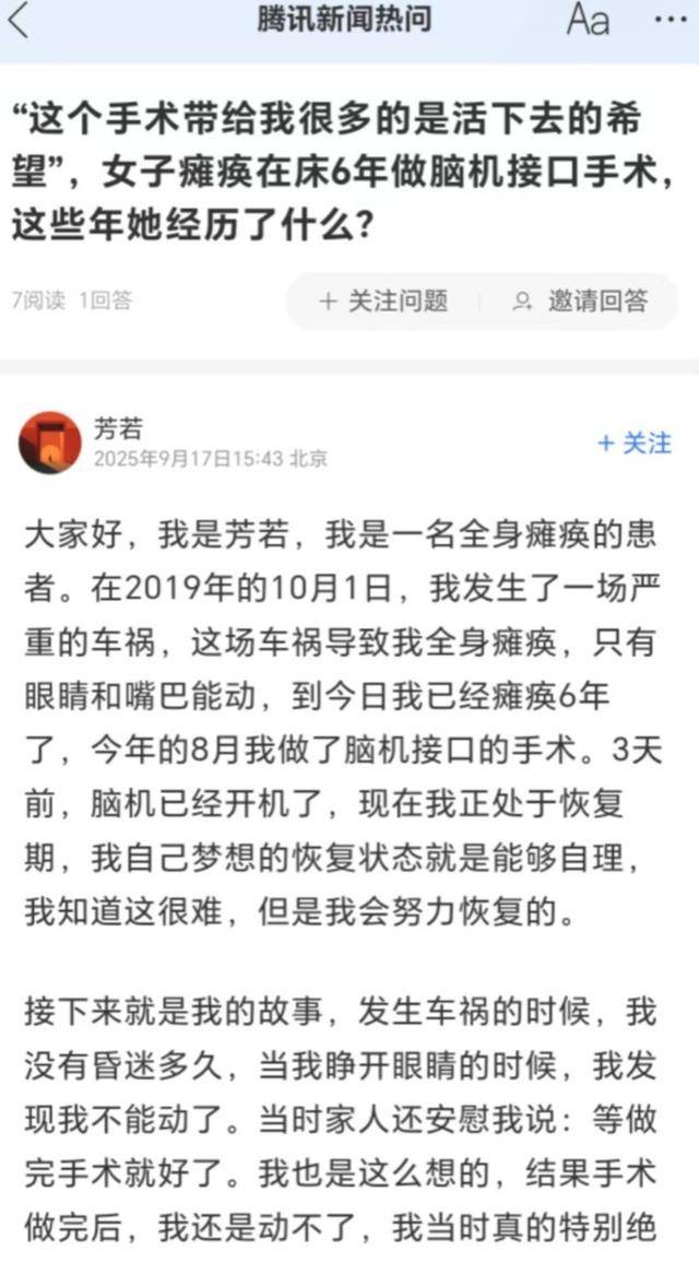 直到今年,芳若做了一个勇敢的尝试——接受脑机接口手术。正是通过这次手术,全身瘫痪6年之后,她第一次通过意念操控自己的手动了起来。欣喜之余,芳若把自己的经历分享到腾讯新闻“热问”网络平台,没想到小小“火”了一把,她不仅收获了一大批新粉丝,还受到了许多媒体的关注。生活,似乎向她敞开了新的大门……