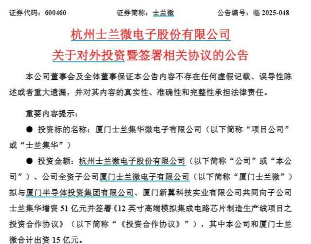 【大河财立方消息】10月19日,杭州士兰微电子股份有限公司(证券简称士兰微)发布公告称,拟投资建设“12英寸高端模拟集成电路芯片制造生产线项目”,同时公司及子公司厦门士兰微电子有限公司(以下简称厦门士兰微)拟与厦门半导体投资集团等签署协议。
